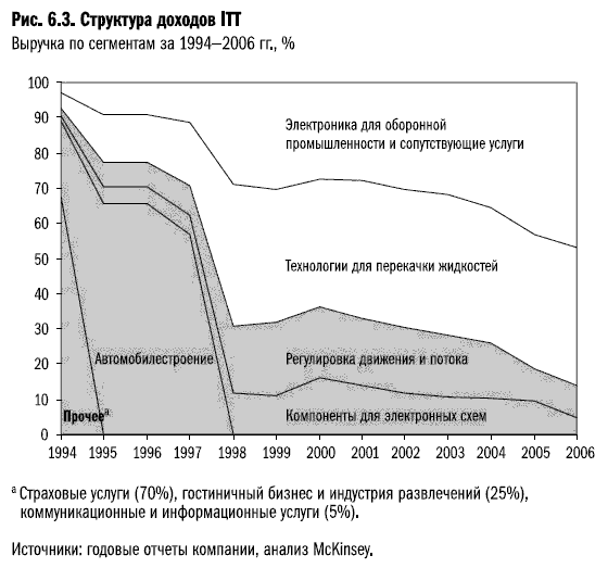 Сегмент 6 представлен компаниями, которым в течение 20 лет удавалось обеспечить прирост стоимости выше среднерыночного при отсутствии реального роста выручки. Чтобы добиться этого, они выбрали другой путь, а именно распределение больших объемов денежных средств между акционерами. Так поступили компании Sears, DuPont, ITT, Rockwell Automation и Fortune Brands.