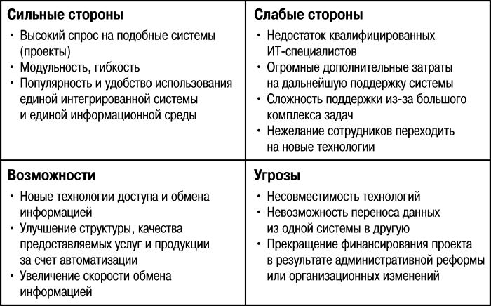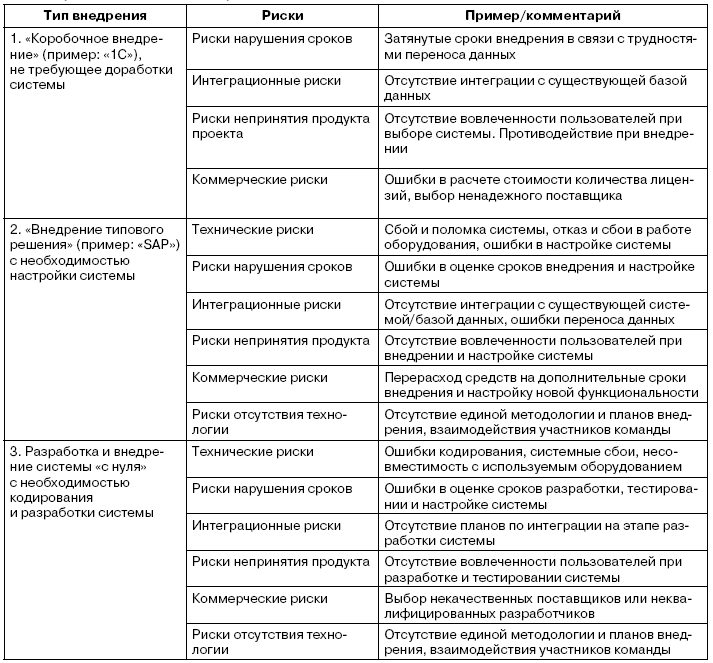 Говоря о проектах информатизации бизнеса и внедрении ИТ, нужно отметить, что любые новые технологии реализуются в условиях большой неопределенности и негативного воздействия окружающей среды. Это вызвано тем, что осуществление и реализация большинства проектов внедрения, особенно крупных, происходят в условиях, когда трудно применить стандартные методы управления. Уникальность целей проекта и отсутствие подобных практик в компании порождают неопределенность относительно выбора и внедрения новых технологий, определения методов и средств достижения поставленной цели, принятия той или иной методологии. Менеджеры ИТ-проектов подбирают и анализируют альтернативные решения, зачастую основанные на собственной интуиции и рекомендациях консалтинговых фирм, что связано с приемом на себя значительного риска.