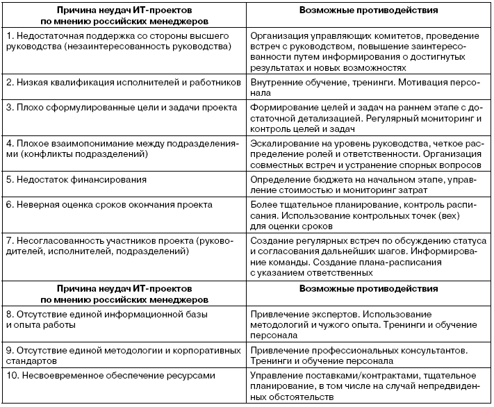Причин провала ИТ-проекта может быть множество. Одной из серьезных могут стать неудачная формулировка и планирование проекта на стадии его инициации. Поскольку неудачи закладываются в проект еще на начальной стадии, желательно как можно раньше проследить, чтобы требуемые результаты были описаны с достаточной точностью, проект рассматривался не с точки зрения ИТ, а как часть всего процесса, направленного на достижение поставленных задач. Уже на этапе инициации и планирования необходимо заложить ключевые цели, выполнить четкую формулировку стадий выполнения проекта, расставить контрольные точки для проверки промежуточных результатов, определить критерии оценки успешности проекта. Начальная стадия проекта имеет ключевое значение для его завершения.