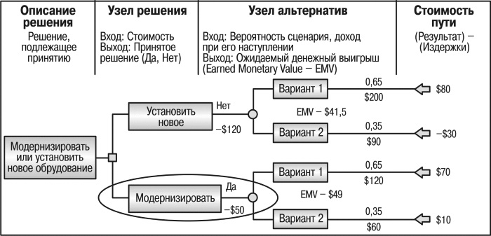 • в случае положительных результатов выбора решения необходимо будет произвести анализ технической реализуемости предлагаемого решения в данном конкретном случае. Анализ потребует привлечения специалистов и проведения целого комплекса работ стоимостью 200 000 долларов. Вероятность успеха – 0,7;