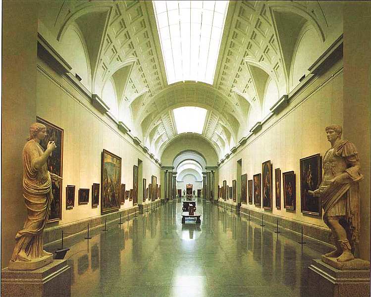 В нем разместилась коллекция, до этого времени рассредоточенная в нескольких королевских резиденциях. Испанский двор попеременно пребывал в нескольких дворцах. К XVIII веку цикл был следующим: с января до середины марта — старое королевское охотничье поместье в парке Прадо; Пасха — в Буэн Ретиро в Мадриде; с апреля по июнь — буколические развлечения в Аранхуэсе; конец июня — снова Буэн Ретиро; с июля по октябрь — горная свежесть Ла-Гранха (дворец Сан-Ильдефонсо), конец октября — начало декабря — крепость-монастырь Эскориал; конец декабря — Рождество — возвращение в Буэн Ретиро. В каждом из этих дворцов имелась художественная коллекция.