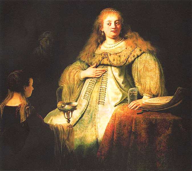 В облике героини угадывается портрет жены художника Саскии. Софонисба в роскошном одеянии, не скрывающем будущего материнства, в украшениях с жемчугами сидит у стола, покрытого ковром, на котором лежит манускрипт. Коленопреклоненная служанка подает ей напиток в чаше, сделанной из раковины наутилуса. Жест Софонисбы можно трактовать как принимающий и одновременно защищающий зародившуюся в ней жизнь. Старуха, стоящая в глубине в тени, с выражением горестного сочувствия наблюдает за этой сценой: Софонисба, не желая украсить собой победу Сципиона, предпочла выпить яд. Главным повествователем в картине у Рембрандта становится свет. Самая светоносная фигура — героиня, стоящий перед ней кубок-наутилус, как роковое отражение, обладает странным, золотисто-перламутровым сиянием, завораживающим и смертоносным.