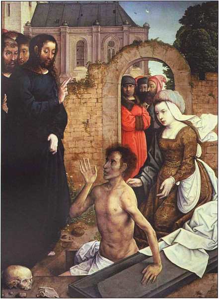 Доска является частью алтаря церкви Св. Лазаря в Паленси и представляет одно из чудесных деяний Христа — воскрешение из мертвых. Этот евангельский эпизод содержится в текстах Иоанна Богослова. На глазах у зрителей Христос сотворил величайшее чудо, доказав свою двойственную природу как Сына Божьего и Сына Человеческого и утвердив свою власть над смертью. Действие разворачивается на фоне ветхой стены с арочным проемом, за ней виден храм. Фландес активно включает в художественный контекст принятые в искусстве Северного Возрождения иносказания. Свидетели чуда теснятся под полуразрушенной аркой, что указывает на Ветхий Завет. Но чудо свершилось, и, как повествует Иоанн Богослов, многие видевшие это уверовали в Иисуса. Тем самым, по слову Иисуса, был возведен храм новой веры, который уже виден и скоро полностью предстанет перед людьми, как только рухнет стена Ветхого Завета, и над миром воссияет Новый Завет. Колорит всей композиции обладает особой цветовой пластичностью, художник мастерски передает пейзаж, детали событий, душевное состояние персонажей — от сомнений до полного уверения. Слитность красочного слоя в полной мере соответствует тому духовному единению людей, которое проповедует новое учение Христа.
