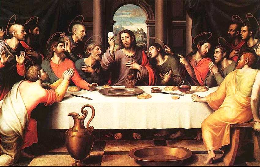 Тайная Вечеря — евангельский сюжет, представленный во многих иконах и картинах. Так называют последнюю тайную в связи с гонением христианства трапезу Иисуса с учениками. Живописцы обычно изображали один из двух драматических моментов вечери: либо утверждение Христом таинства причастия, либо Его пророчество о предстоящем предательстве одного из учеников. Хуанес наделяет каждого из апостолов яркой индивидуальностью. Иисус же пристально смотрит на Иуду, единственного из всех апостолов лишенного нимба.