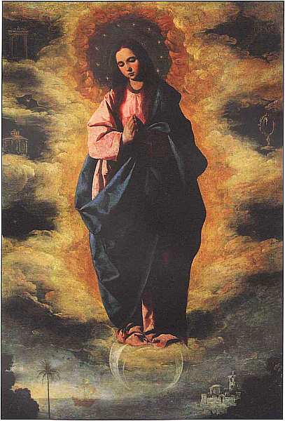 На картине «Непорочное зачатие» Богородица, под чьими ногами изображен земной шар, парит в небе. Ее окружают ангелы, белый голубь, являющий собой символ Святого Духа, раскрыл свои крылья над головой Девы. Превосходство Богоматери над земным злом олицетворяет пальмовое дерево, которое лежит на переднем плане. Мария попирает ногами змея с яблоком в пасти, символизирующего первородный грех. Постулат о том, что Богоматерь — зеркало всех добродетелей, подтверждает изображенное на полотне зеркало.