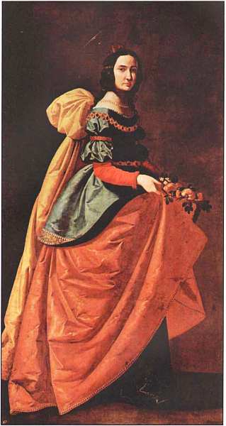 Многие образы мастера лишены религиозности, как, например, в картине «Святая Касильда». О ее подвиге — тайной от отца, мавританского правителя, исповедовавшего ислам, помощи пленным христианам — напоминает ее решительное смуглое лицо с жестким, строгим взглядом. В остальном же на портрете — знатная дама, гордая, не лишенная грации, в дорогом, нарядном платье. Но святая держит в руках цветы — символ чудесного спасения от кары отца. Сурбаран, прекрасный колорист, удивительно точно передал блеск шелка, жемчуга, воздушность фона. Художником использованы насыщенные темно-зеленые и лиловые тона.
