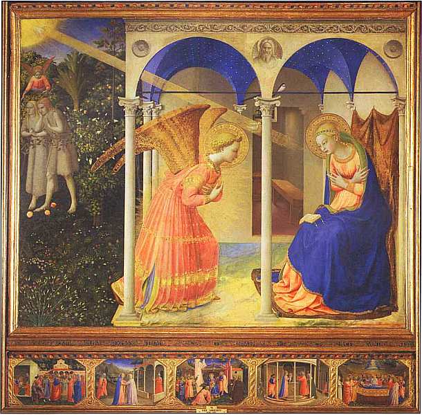 В левой части композиции изображен Эдем: архангел Михаил изгоняет из рая Адама и Еву. В глубине видно Древо познания. Райский сад, одна из ипостасей Богоматери, символизирует ее непорочность («hortus randusus» — «запертый сад»). Соединение ветхо- и новозаветного эпизодов имеет глубокое богословское обоснование: вдали изображены последствия грехопадения, в то время как на первом плане — зачатие Иисуса, чья смерть послужит искуплением. Мария трактуется как «новая Ева», свободная от недостатков.