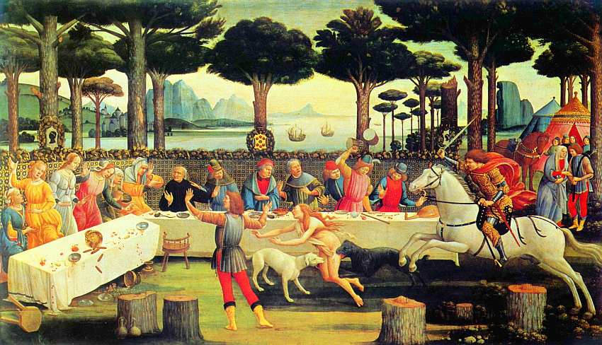 Сандро Боттичелли (1445–1510) Серия картин к новеллам «Декамерон». Ужин Настажио у Онисти, III-й эпизод Около 1483. Дерево, темпера. 84x142