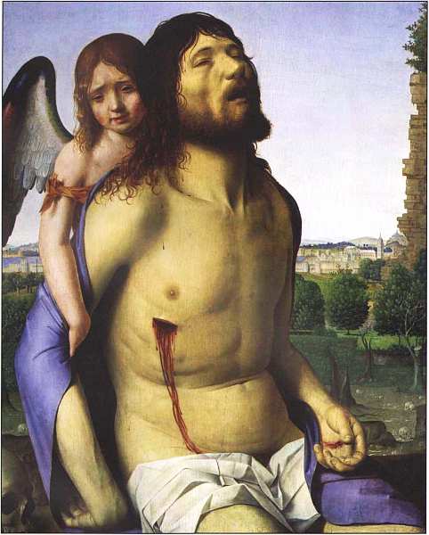 На картине «Мертвый Христос, поддерживаемый ангелом» на озаренном светлом фоне, где с трудом различается родной город мастера Мессина, отчетливо вырисовываются фигуры Христа и ангела. Ангел плачет, но как бы внутри, про себя. Только его глаза потемнели, покраснел и веки, искривилось личико, и он не смог сдержать две почти невидимые слезы, оставившие влажные следы. Христос мертв; светлое небо лишь подчеркивает скорбь держащего его ангела. Иконография и эмоциональная трактовка темы связаны с творчеством Джованни Беллини.