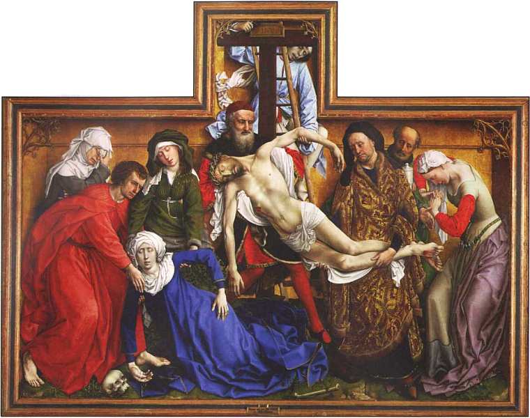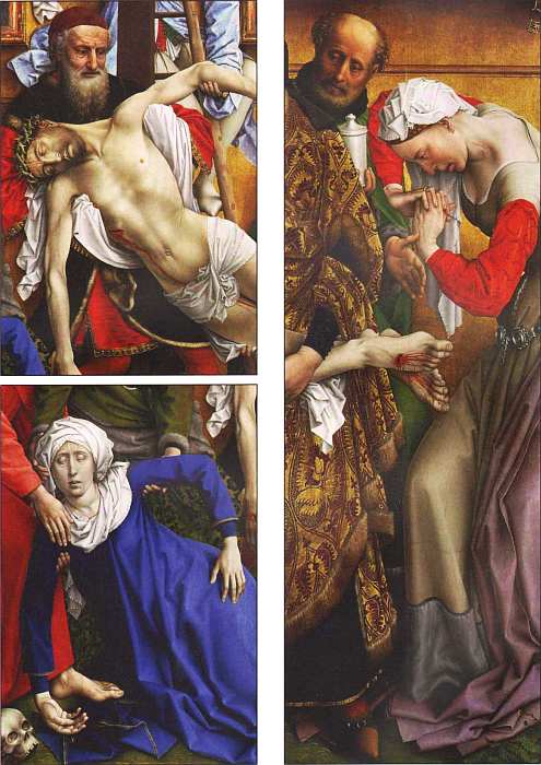 Фигура Девы Марии находится в необычном для нидерландской живописи положении: почти повторяет позу сына. Так Ван дер Вейден нарушил существовавшие каноны и показал безусловную преданность матери. Руки Христа и Девы направлены к черепу Адама — это символ сущности искупления грехов. Фламандский художник заставляет зрителя сопереживать, раскрывая мир чувств своих героев.