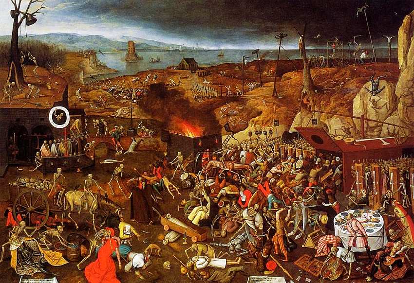 Полотно «Триумф смерти» напоминает человечеству о неотвратимости смерти. Автор считает смерть завершением всего, ибо она не оставляет никаких надежд — ни на славу, ни на вечность. Смерть представлена в виде армии скелетов, выставивших вместо щитов гробовые крышки с крестами. Скелеты вершат свой страшный суд, которого никто не избежит — ни царь, ни раб, ни проповедник, ни грешник. Люди, пытаясь спасти от смерти, устремляются в лаз, на крышке которого тоже стоит крест, но это место кажется не спасением, а своеобразной мышеловкой смерти.