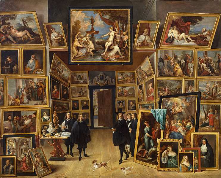 На этом полотне Тенирс изобразил картинную галерею эрцгерцога Леопольда Вильгельма, известного ценителя искусства, сравнимого лишь с королем Испании Филиппом IV. Эрцгерцог, будучи наместником в Нидерландах, собрал великолепную коллекцию произведений фламандских и итальянских мастеров. Художник, поступив к нему на службу, в 1651 был назначен хранителем собрания. Он решил увековечить сокровища галереи. Так, благодаря ему был создан «гравированный каталог» собрания, называвшийся «Театр живописи». Также Тенирс написал полотна с изображениями интерьера самой картинной галереи. В представленной работе рядом с экспонатами знаменитой коллекции зритель видит и самого владельца. Полотно сегодня представляет не только художественную, но и историческую ценность, потому что копии произведений знаменитых предшественников живописца исполнены поразительно точно.