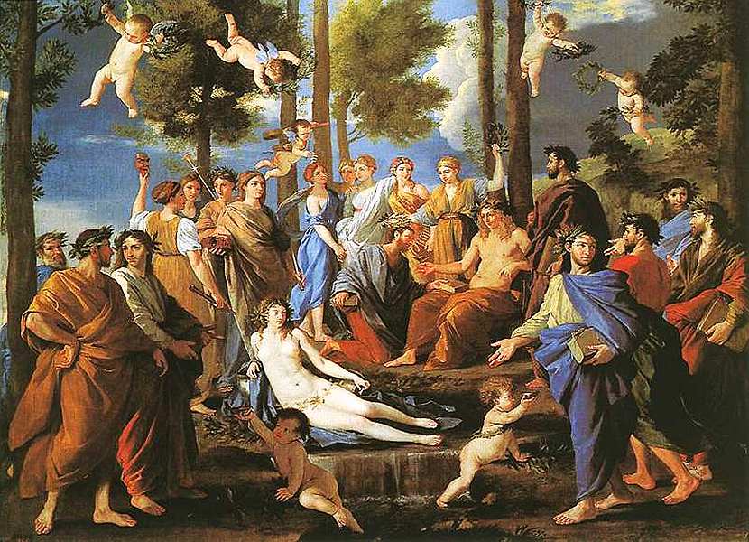 Композиция этого многофигурного полотна позаимствована художником из фрески Рафаэля «Парнас», которую прославленный итальянец создал для Сикстинской капеллы. Пуссен почти точно скопировал и расстановку фигур, и строгие вертикали деревьев, и даже цветовые соотношения. Круговая композиция и идеально проработанные складки на тогах поэтов свидетельствуют о присутствии в живописи мастера традиций итальянского Возрождения. Красочная насыщенность произведения говорит о влиянии на Пуссена творчества Тициана.