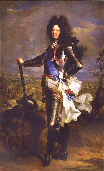 «Портрет Людовика XIV» был написан в 1701. Король-солнце представлен стоящим в полном вооружении на фоне долины, где разворачиваются боевые действия. Белая развевающаяся ткань, охватывающая талию модели, своими очертаниями напоминает цветок лилии — геральдический символ Бурбонов. Портрет показывает монарха на вершине его могущества.