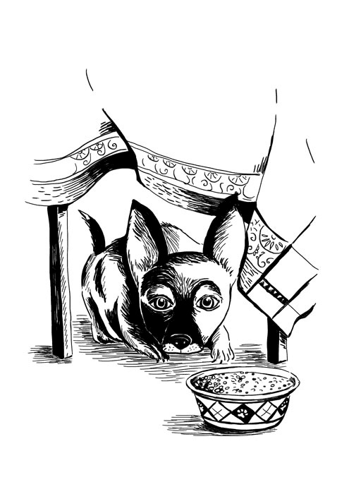 Собака, услышав своё имя, дружелюбно замахала хвостом, но потом внезапно сорвалась и с лаем выбежала из-под стола.