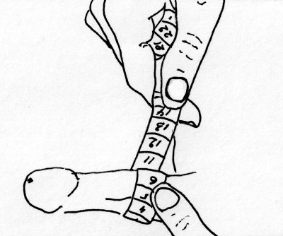 Итак, берем линейку, у которой «0 см» с самого края, и меряем. Некоторым, у кого член в рабочем положении слегка изогнут, это кажется несправедливым — они думаю, что если эту кривизну померять портновским сантиметром, то лишние 2 миллиметра сильно изменять картину. Пускай! Главное, сантиметр прикладывайте так, чтоб длину не пришлось читать в дюймах — а то будет вообще грустно. 10 дюймов звучит хуже, чем 25 сантиметров, но 4,5 дюйма — это уж совсем… Короче, замеряем свой член. Если нет сантиметровой ленты, подойдет линейка ученическая, рулетка строительная, или нитка. Ниткой измеряете или полоской бумаги, потом к линейке прикладываете. В конце концов можно измерить спичечными коробками. Длина стандартного, «а-ля советского» коробка — 5 см.