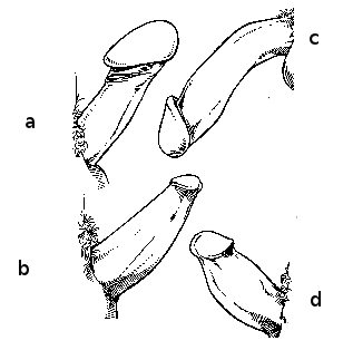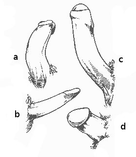 РИС. 4. Редкие формы члена: a — изогнутый; b — остроконечный; с — ровный; d — микрочлен-гриб.
