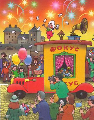 Силач Бегемот бил в литавры, клоун Мокус играл на тромбоне, юная Триолина водила смычком по скрипке, Бамбино вёл машину, а знаменитый поросёнок Фунтик делал сразу два дела: разбрасывал цирковые афишки и дарил автографы направо и налево.