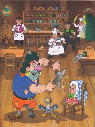 И тут штора раздвинулась, и перед пиратом предстали Триолина со сковородкой в руках, Бегемот в боксёрских перчатках и дядюшка Мокус с очень строгим лицом.