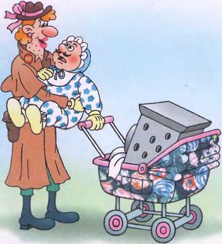 Те, кого простые люди принимали за мамашу с ребёнком, были на самом деле сыщики Добер и Пинчер! Да и сейф на детской коляске от зоркого взгляда Бегемота им было не утаить.