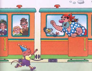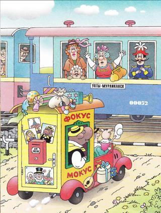 — Вперёд, друзья! — приказал Мокус, усаживая артистов в автомобиль. И команда тотчас же погрузилась, ожидая чуда от новых мест и нового дня. И лишь за городом, у переезда, автомобильчик дядюшки Мокуса на мгновение попридержал ход: встречный поезд спешил в городок, который только что покинули наши друзья.