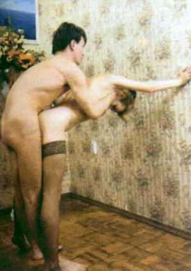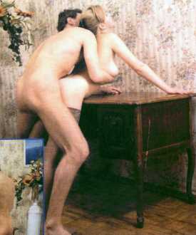 35. Эта позиция аналогична предыдущей, за исключением того, что женщина правую ногу кладёт коленом, а ещё лучше ступнёй, на стол. За счёт подобного положения ноги, приводящего к развороту влагалища, достигается очень глубокое проникновение члена.