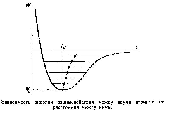 Качественно ясно также, что для того, чтобы исключить взаимодействие между соседними атомами, которые находятся на «равновесном» расстоянии l = l0, т. е. развести их на бесконечное расстояние, необходимо затратить вполне определенную энергию. Это означает, что при l = l0 энергия W = W0 будет отрицательной: именно она характеризует прочность связей в кристалле. Чем больше отрицательное значение , тем прочнее связи между атомами, тем большую энергию надо потратить для того, чтобы испарить кристалл. Так как испарить кристалл — это значит развести составляющие его атомы на бесконечность, то, очевидно, энергия и является мерой теплоты испарения.