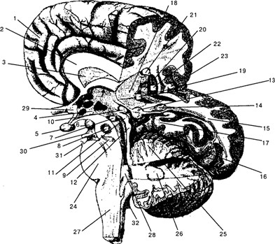 1 – медиальная поверхность лобной области правого полушария; 2 – мозолистое тело (corpus callosum); 3 – прозрачная перегородка (septum pellucidum); 4 – ядра гипоталамуса (nuclei hypothalami); 5 – гипофиз (hypophisis); 6 – мамилярное тело ( corpus mamillare); 7– субталамическое ядро (nucleus subthalamicus); 8 – красное ядро (nucleus ruber) (проекция); 9 – чёрная субстанция (substantia nigra)(проекция); 10– шишковидная железа (corpus pineale); 11 – верхние бугорки четверохолмия (colliculi superior tecti mesencepholi); 12 – нижние бугорки четверохолмия (colliculi inferior tecti mesencephali); 13 – медиальное коленчатое тело (МКТ) (corpus geniculatum mediale); 14 – латеральное коленчатое тело (ЛКТ) (corpus geniculatum laterale); 15 – нервные волокна, идущие от ЛКТ в первичную зрительную кору; 16 – шпорная извилина (sulcus calcarinus); 17– гиппокампальная извилина (girus hippocampalis); 18 – таламус (thalamus); 19 – внутренняя часть бледного шара (globus pallidus); 20 – наружная часть бледного шара; 21 – хвостатое ядро (nucleus caudatus); 22 – скорлупа (putamen); 23 – островок (insula); 24 – мост (pons); 25 – мозжечок (кора)(cerebellum); 26– зубчатое ядро мозжечка (nucleus dentatus); 27– продолговатый мозг (medulla oblongata); 28– четвёртый желудочек (ventriculus quartus); 29 – зрительный нерв (nervus opticus); 30 – глазодвигательный нерв (nervus oculomotoris); 31 – тригеминальный нерв (nervus trigeminus); 32 – вестибулярный нерв (nervus vestibularis). Стрелкой обозначен свод
