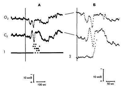 Б – пример записи импульсной активности нейрона (нейронограмма)