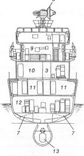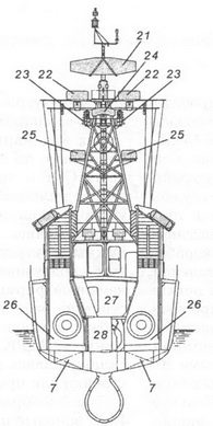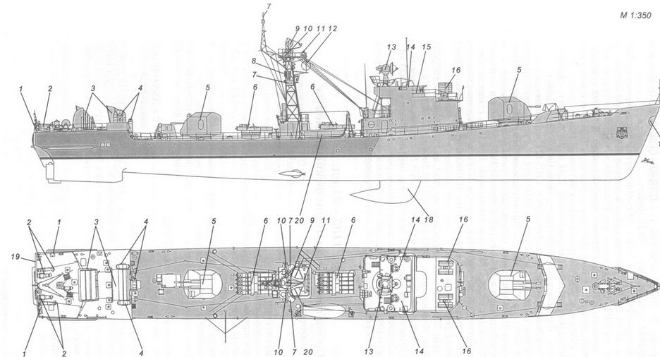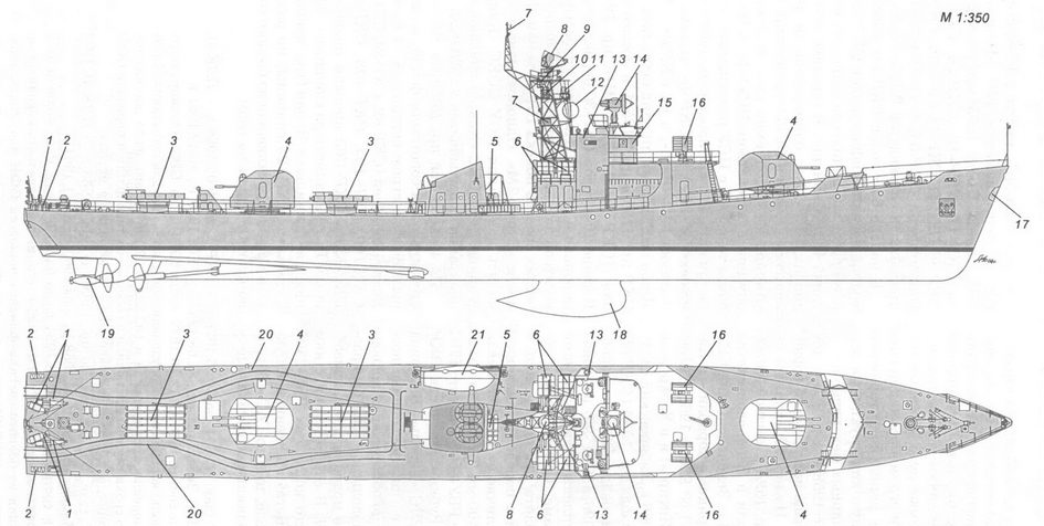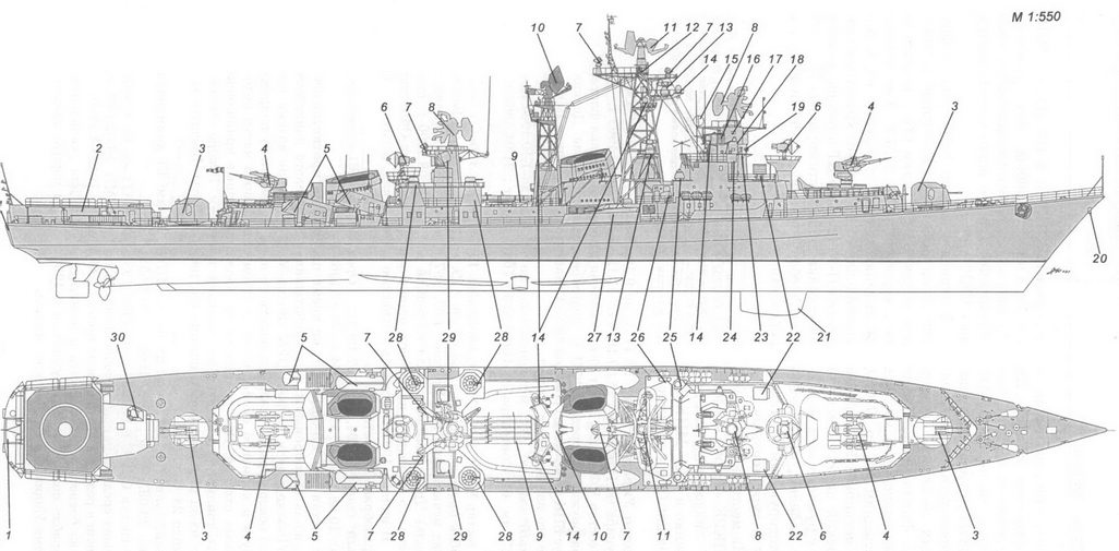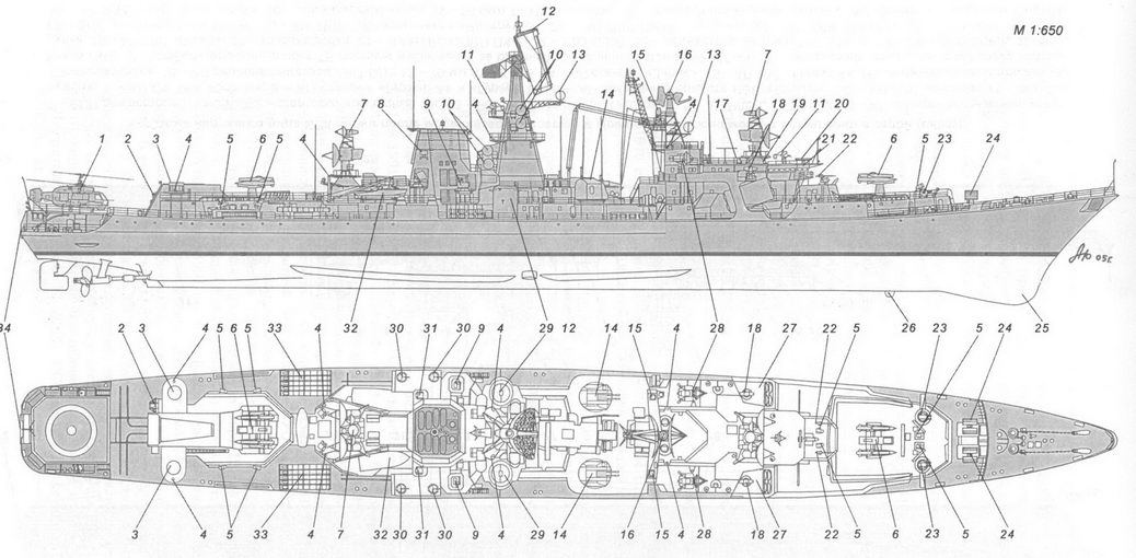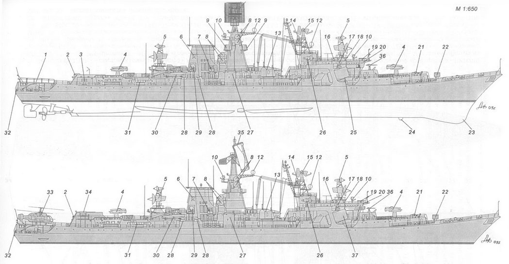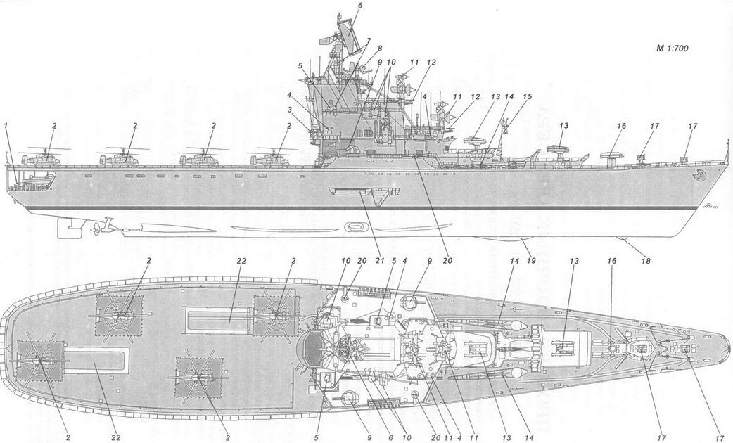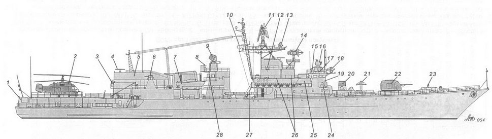 1 – рабочее тело и лебедка ПОУ ГАС «Вега»; 2 – вертолет Ка-25ПЛ; 3 – стартово-командный пост; 4 – стабилизированный пост ТВ системы наблюдения за ближней надводной обстановкой МТ-45; 5 – АП РЛС СУАО «Барс»; 6 – АП РЛС «Восход»; 7 – АП станции «Залив 11-16»; 8 – АП РЛС «Ангара-А»; 9 – 57-мм АУ АК-725; 10 – АП станций «Гурзуф» и «Гурзуф-1»; 11 – АП РЛС СУО «Гром»; 12 – АП РЛС «Дон-2»; 13 – ПУ ЗРК «Шторм»; 14 – грузовой кран; 15 – заваливающаяся мачта АП радиопеленгатора и навигационных огней; 16 – ПУ ПЛРК «Вихрь»; 17 – РБУ-6000; 18 – обтекатель антенны ГАС «Хоста» (ЗПС); 19 – обтекатель антенны ГАС «Орион»; 20 – ПУ НУРС СППП ПК-2; 21 – лацпорт 533-мм ТА; 22 – вертолетоподъемник.