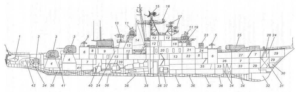 1 – рабочее тело ГАС «Вега»; 2 – лебедка ПОУ ГАС «Вега»; 3 – вертолет Ка-25ПЛ; 4 – нижний (основной) ангар; 5 – кубрики личного состава; 6 – верхний ангар; 7 – стартово-командный пост; 8 – боевые посты РТВ и выгородки ВЧ блоков; 9 – дымоход; 10 – АП РЛС «Восход»; 11 – АП РЛС «Ангара-А»; 12 – АП РЛС СУО «Гром»; 13 – АП РЛС «Дон»; 14 – штурманская рубка; 15 – оптический перископический визир ходовой рубки; 16 – ходовая рубка; 17 – каюты офицеров; 18 – ПУ ЗРК «Шторм»; 19 – погреб ЗУР; 20 – ПУ ПЛРК «Вихрь»; 21 – погреб ПЛУР; 22 – помещение приводов и агрегатов ПУ ПЛРК «Вихрь»; 23 – РБУ-6000; 24 – погреб РГБ; 25 – кладовые различного назначения; 26 – топливные цистерны; 27 – помещение приводов и агрегатов ПУ ЗРК «Штом»; 28 – помещение приводов и агрегатов ПОУ ГАС «Орион»; 29 – обтекатель ГАС «Орион»; 30 – антенна ГАС «Орион»; 31 – главный паровой котел КВН-95/64; 32 – носовое МКО; 33 – носовой энергоотсек; 34 – ТГ; 35 – носовая электростанция; 36 – отсек вспомогательных механизмов и успокоителя качки; 37 – пост дистанционного управления кормового МКО; 38 – ГТЗА ТВ-12; 39 – кормовое МКО; 40 – ДГ; 41 – кормовой энергоотсек; 42 – кормовая электростанция; 43 – цистерна авиационного топлива; 44 – погреб авиационного боезапаса; 45 – отделение рулевых машин; 46 – помещение агрегатов ПОУ ГАС «Вега».