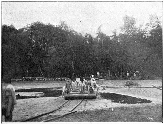 Er ligt een Kaja-Kaja gehucht in de buurt van Merauke, een klein uur gaans verder langs het strand. De weg er heen gaat door een klapper-aanplanting, waarvan de “copra-ruilers,” hier op de Zuidkust wat op de Noordkust de “jagers” zijn, den oogst komen ophalen. Een regelmatig rooster van rechte slooten over het geheele terrein heen getrokken, zóó dat de stortvloeden van den natten moesson een snelle afwatering vinden naar de zee, ligt daar als een bewijs van wat het volk van het gehucht met zijn weinig ontwikkeld verstand bedenken en met zijn gebrekkige werktuigen—als een aangepunte stok, in steê van een spade gebruikt, een werktuig heeten mag—uitvoeren kan.