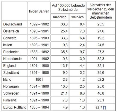 Auf je 100 männliche Selbstmörder kamen weibliche 1898 26,8, 1899 27,2, 1900 26,8, 1904 28,5, 1907 31. Aber im Lebensalter zwischen 15 und 30 Jahren ist allgemein die prozentuale Selbstmordziffer der Frauen höher als der Männer. So betrug der Prozentsatz der Selbstmörder im Lebensalter zwischen 15 bis 20 und 21 bis 30 Jahren im Durchschnitt: