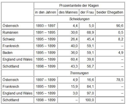 In Österreich kam es im Jahre 1899 zu 856 Ehescheidungen und 133 Ehetrennungen, 1900 1.310 und 163, 1905 1.885 und 262. Es hat sich also im Laufe eines Jahrzehntes die Zahl der Ehescheidungen und Ehetrennungen mehr als verdoppelt. In Wien fanden 1870 bis 1871 148 Ehescheidungen statt, sie stiegen Jahr für Jahr und beliefen sich 1878 bis 1879 auf 319 Fälle. Aber in Wien, als einer überwiegend katholischen Stadt, sind Ehescheidungen sehr schwer durchzusetzen; nichtsdestoweniger konnte schon Mitte der Achtziger Jahre ein Wiener Richter die Äußerung machen: "Die Klagen wegen gebrochener Ehe sind so häufig wie die wegen zerbrochener Fensterscheiben."