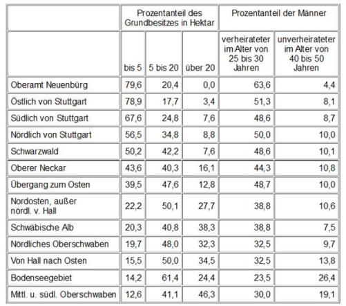 Aber nicht bloß die Erwerbsverhältnisse, auch die Eigentumsverhältnisse wirken in hohem Grade auf die Eheschließungen ein. Schmollers Jahrbuch für 1885, Heft 1, gibt Mitteilungen über die Bevölkerungsstatistik des Königreichs Württemberg, aus welchen schlagend hervorgeht, daß mit der Zunahme des Großgrundbesitzes die Zahl der verheirateten Männer im Alter von 25 bis 30 Jahren abnimmt und die Zahl der unverheirateten Männer zwischen 40 und 50 Jahren zunimmt.