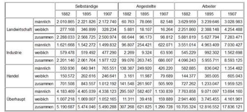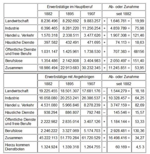 Im Jahre 1882 bildeten die in der Landwirtschaft im Hauptberuf Erwerbstätigen 43,38 Prozent, 1895 36,19 und 1907 nur noch 32,69 Prozent der Erwerbstätigen; die gesamte landwirtschaftliche Bevölkerung umfaßte 1882 42,51 Prozent, 1895 35,74 und 1907 nicht mehr als 28,65 Prozent der Bevölkerung überhaupt. Dagegen bildeten die in Industrie (einschließlich Bergbau und Baugewerbe) im Hauptberuf Erwerbstätigen 1882 33,69 Prozent, 1895 36,14 und im Jahre 1907 37,23 Prozent. Mit ihren Angehörigen bildeten sie 1882 35,51, 1895 39,12, aber im Jahre 1907 schon 42,75 Prozent. Für die in Handel und Verkehr Erwerbstätigen und ihre Angehörigen waren die betreffenden Zahlen: