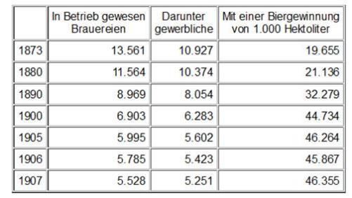 Die Zahl der in Betrieb gewesenen Brauereien sank also von 1873 bis 1907 um 8.033 = 59,3 Prozent, die Zahl der gewerblichen Brauereien sank um 5.676 = 51,9 Prozent, dagegen stieg die Bierproduktion um 26.700.000 Hektoliter = 135,7 Prozent. Das bedeutet Zusammenbruch der kleinen und mittleren Betriebe und gewaltige Vergrößerung der Großbetriebe, deren Leistungsfähigkeit sich vervielfacht: im Jahre 1873 auf eine Brauerei 1.450, im Jahre 1907 8.385 Hektoliter. So ist es überall, wo der Kapitalismus zur Herrschaft kommt. In Österreich gab es im Jahre 1876 2.248 Brauereien, die 11.671.278 und im Jahre 1904/05 nur noch 1.285, die aber 19.098.540 Hektoliter Bierwürzen erzeugten.