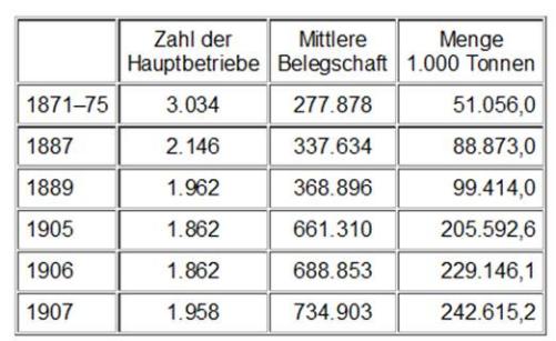 In der Steinkohlenproduktion hatte sich also seit den siebziger Jahren die Zahl der Betriebe um 49,8 Prozent vermindert, dagegen war die Zahl der beschäftigten Arbeiter um 216,9 Prozent und die Produktion sogar um 420,6 Prozent gewachsen.
