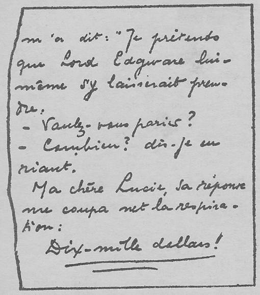 Si elle a joué un rôle quelconque dans la mort de ce malheureux homme, ce fut tout à fait innocemment… comme sa lettre vous le prouvera. Je vous en envoie l’original, puisque vous m’en manifestez le désir. J’ai hésité avant de m’en séparer, mais je sais que vous en prendrez grand soin et que vous me la rendrez ; si elle doit contribuer à éclaircir le mystère qui entoure sa mort, je vous la confie sans hésiter.