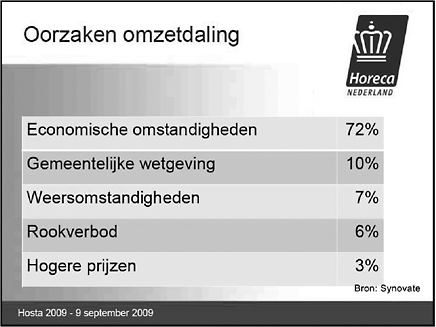 Figuur 7: Oorzaken van omzetdaling in de horeca. Bron: Een presentatie van Hajé de Jager, voorzitter van Koninklijke Horeca Nederland van 9 september 2009.