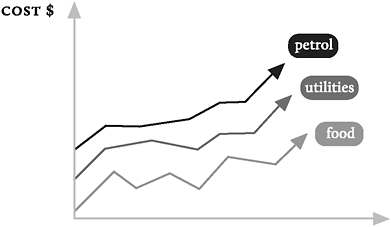De kosten voor petrol zijn hoger dan die van utilities, die op hun beurt weer hoger zijn dan die van food. Dat is de enige conclusie die ik op basis van figuur 11 kan trekken. Omdat het niet duidelijk is of de x-as de tijd weergeeft, kun je niet eens concluderen dat de kosten in de loop der tijd zijn gestegen. Het kunnen net zo goed de rijlengtes van kassa’s zijn of het aantal klanten dat tegelijkertijd online is. Dit voorbeeld illustreert de belangrijkste truc in grafiekenland, namelijk informatie weglaten. Hoe minder informatie een maker of gebruiker geeft, des te makkelijker is een grafiek te manipuleren. Of je nou in Singapore bent of hier.