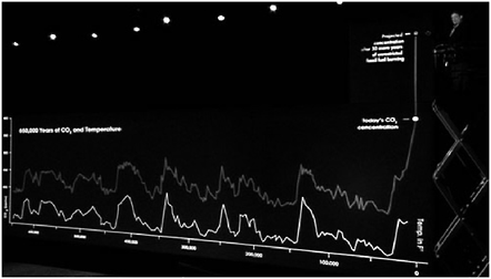 Als je goed kijkt kun je in figuur 13 zien dat de verticale as in de onderste grafiek niet bij nul begint. In figuur 12 is dat wel het geval. Daardoor lijken de schommelingen in de onderste grafiek groter. Om het dramatische effect te vergroten, kun je de verticale as eerder laten ophouden terwijl de grafieklijn nog even doorloopt. Het effect van een grafieklijn die verder loopt dan de hoogste grafiekwaarde, is dat die grafieklijn out-of-scale raakt. De lijn knalt als het ware de grafiek uit. Een dergelijke presentatie versterkt het extreme aspect van de waarde, maar gaat nog verder. De meeste lezers krijgen het gevoel dat een dergelijke hoge grafiekwaarde buitenproportioneel en dus onacceptabel is. Van precies dit effect maakt bijvoorbeeld Al Gore slim en suggestief gebruik in zijn film An Inconvenient Truth. Om het dramatische effect van de door hem gepresenteerde cijfers te vergroten, klimt hij halverwege zijn verhaal op een hoogwerker. Hij ‘toont’ hiermee automatisch aan hoe onacceptabel hoog de stijging van gemeten CO2 is. Een dergelijke act speelt – los van de discussie of het verhaal inhoudelijk klopt - in op gevoelens van verontwaardiging bij het publiek.