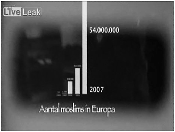 Het betreffende stukje uit de film toont achter elkaar deze eerste vier balken. Die verkleinen vervolgens. Dat wekt de suggestie dat het ergste nog moet komen. Inderdaad, ze maken als het ware plaats voor een vijfde en buitenproportioneel grote kolom. Deze hoogste staaf schiet letterlijk het scherm uit. Die staat echter niet voor het meest recente aantal moslims in Nederland, maar in Europa. Europese cijfers worden dus opeens naast Nederlandse cijfers gezet en waar komt die 54 miljoen vandaan? Misschien telde Wilders ook aantallen moslims uit Rusland en Turkije mee. Met dat soort noodzakelijke informatie wordt de kijker van Fitna echter niet vermoeid. De grafiek ziet er spectaculair uit, maar is niet minder manipulerend dan die van Al Gore.