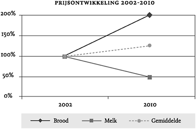 1 voor zowel een brood als een liter melk in het jaar 2002.