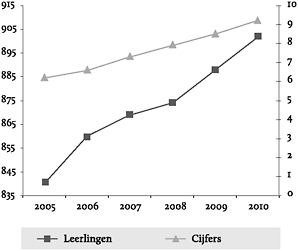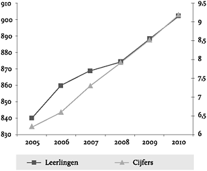 In de vorige paragrafen heb ik enkele basistrucs besproken waarmee een grafiek vrij eenvoudig kan worden gemanipuleerd. Eén van de gemakkelijkste manieren is nog niet genoemd. Met behulp van een lijndiagram kan de maker of gebruiker de boodschap nog sterker manipuleren. In een lijndiagram staan tegelijkertijd twee verschillende verticale Y-assen, zoals is te zien in zelfgemaakte onderstaande figuren 20 en 21. Dit is een veelgebruikte diagramtechniek. Op die manier kan je verschillende gegevens in één grafiek krijgen. In figuren 20 en 21 zijn dat cijfers en aantallen leerlingen. Met één as zijn de getallen voor aantallen leerlingen te hoog ten opzichte van de rapportcijfers. De eerste getallen lopen in de honderden, terwijl de laatste getallen niet boven de tien uitkomen. De rapportcijfers zouden niet te zien zijn bij het gebruik van één as. Door twee Y-assen te gebruiken, los je dat probleem op.