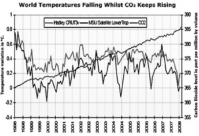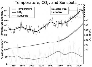 Het volgende niet-fictieve voorbeeld van een lijndiagram is ook de moeite waard. In november 2009 hekelt onafhakelijk econoom en auteur Hans Labohm in een weblog op NOS.nl alle commotie rondom het klimaat. Hij stelt: “De gemiddelde wereldtemperatuur is de laatste tien jaar namelijk gedaald, terwijl de CO2–concentratie in de atmosfeer nog steeds stijgt”. Deze stelling onderbouwt hij met een grafiek. Die grafiek is handig gekozen. Door het gebruik van twee assen, ontstaat de indruk dat de CO2-concentratie boven de temperatuur uitstijgt terwijl dit geen effect heeft op de temperatuur. De temperatuur blijft zo ongeveer gelijk. KNMI weerman en NOS journaal weerpresentator Gerrit Hiemstra vroeg zich in een reactie af, waarom Labohm slechts tien jaar liet zien. Hiemstra presenteerde een gelijke grafiek over een langere periode.