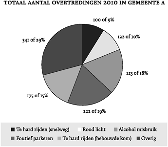 Veel makers van taartdiagrammen laten bewust of onbewust wat categorieën weg. Denk aan “Overig”, “Geen mening” of “Weet niet”. Die categorieën horen echter bij de taart, zeker als ze ook nog eens een aanzienlijk grote taartpunt vormen. Tel je de percentages in figuur 24 op, dan kom je uit op honderd procent. Zo op het eerste gezicht lijkt er dus niets mis met de weergave van de totale waarde in verschillende partjes. Omdat we echter niet weten of het in bovenstaand diagram gaat om in totaal twaalf of 1200 overtredingen, is de grafiek waardeloos. Het gaat bij een taartdiagram dus niet om de zo mooi zichtbaar gemaakte verhoudingen, maar om de relatieve verhoudingen ten opzichte van het totaal. Zonder die informatie zegt een taartdiagram de consument niets.