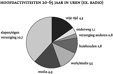 Het diagram uit figuur 26 komt uit een presentatie over een onderzoek naar tijdsbesteding door de Stichting tot Promotie en Optimalisatie van Televisiereclame (SPOT) uit 2008. Het figuur laat zien waar wij Nederlanders gedurende één dag zoal onze tijd aan besteden.