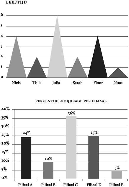 In het onderste voorbeeld maakt het driedimensionale effect de zaken ook al niet duidelijker. De percentuele bijdrage per filiaal is misleidend. Alle bijdrages lijken hoger dan ze in werkelijkheid zijn. Daarnaast valt het effect voor Filiaal E bijna in het niet. Filiaal C zit op 36 % maar lijkt ver boven de veertig procent uit te stijgen.