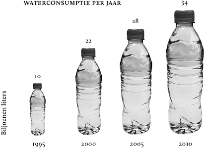 De keuze voor het lange, rondbuikige flesje in een 3D afbeel ding is hier debet aan. Die factoren zorgen ervoor dat de breedte en de diepte vier keer zo groot worden. Gevoelsmatig is de waterconsumptie dus niet 3,5 keer groter geworden, maar 3,5 × 4 × 4 = 56 keer groter.